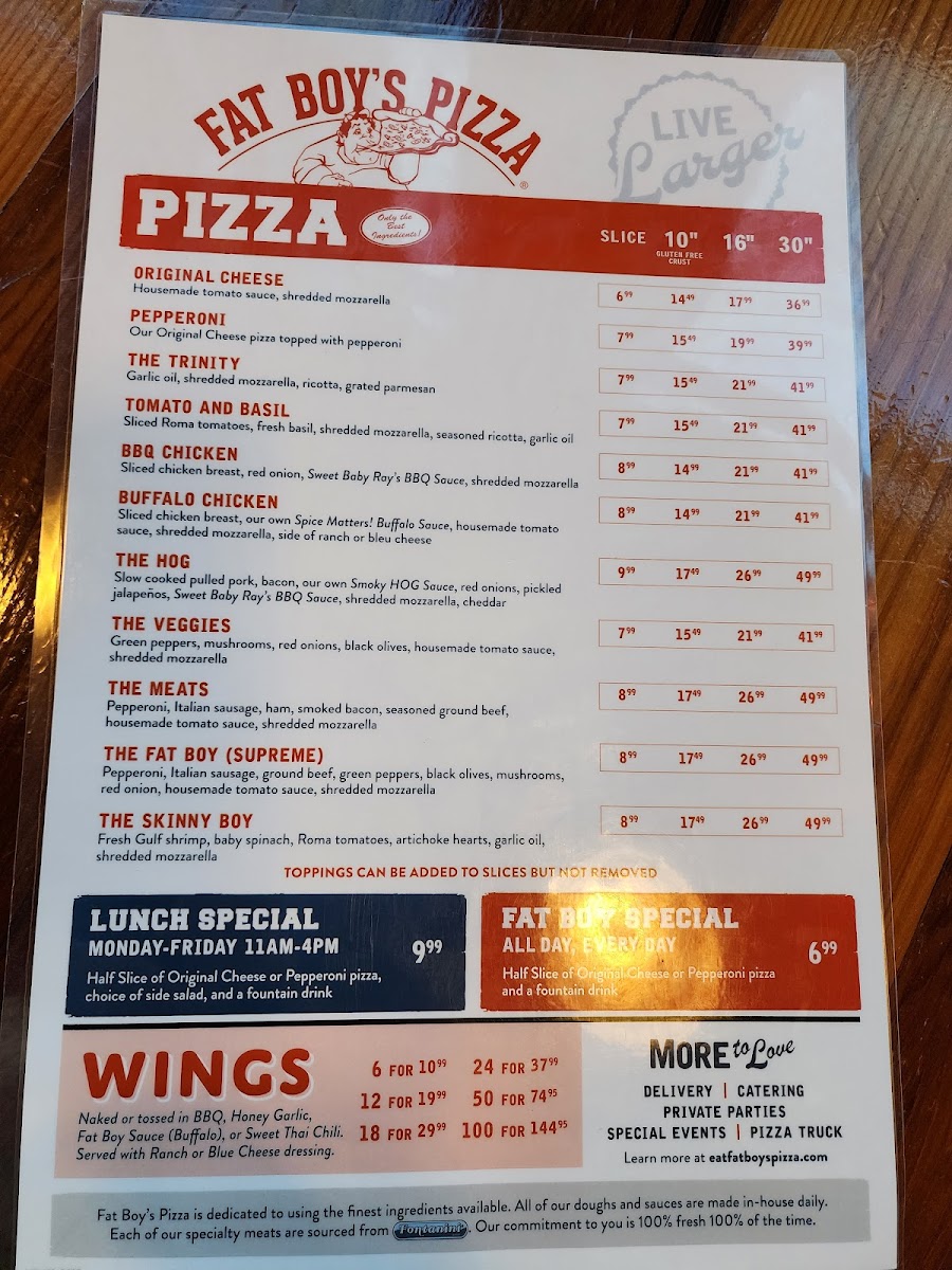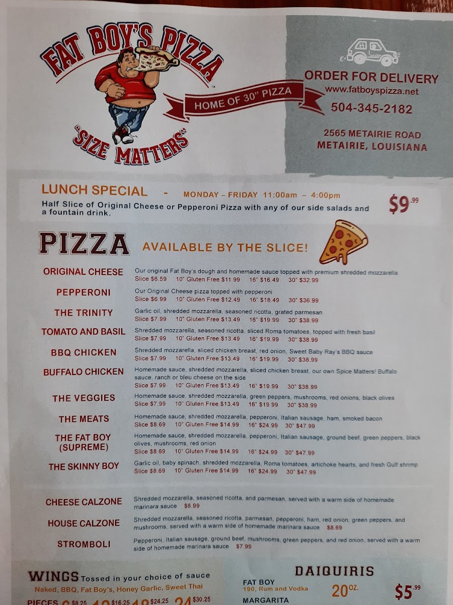 Welcome to Fat Boy's Pizza Metairie, where the name embodies the delightful indulgence you'll experience. Nestled at 2565 Metairie Rd, Metairie, LA, this pizzeria is renowned for its generously sized slices that are as mouthwatering as they are hefty. Diners rave about their pepperoni pizza, described as cheesy, toasty, and bursting with flavor—so large that many opt to share or save leftovers for later.